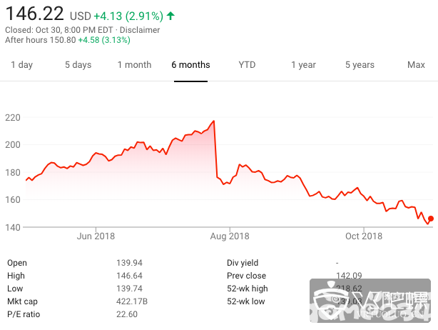 Facebook第三季度EPS为每股盈利1.76美元,高于市场预期的1.47美元。营收137.3亿美元,弱于预期的138亿美元。美国和加拿大的每日用户数量在今年前两个季度基本没有增长,但第三季度持平。该公司预计第四季度营收将继续下滑。